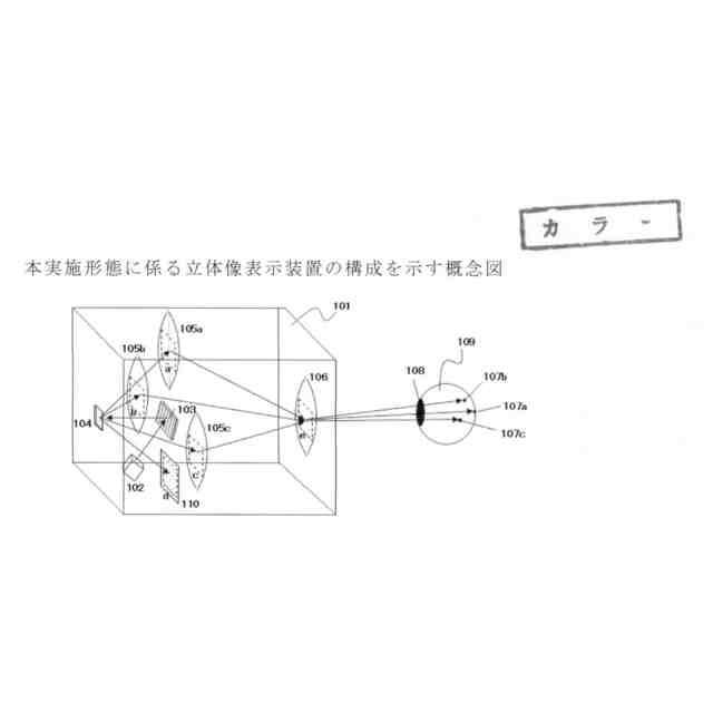 次に別の従来技術である特許文献2を例示する。特許文献2はヘッドマウントディスプレイのような接眼系システムでは無く、多くの人が裸眼で立体画像を見るライトフィールドディスプレイに関するものである。光源と、投影レンズと、光源から投影レンズまでの光路沿いに複数のピクセルを含む第1のデジタルマイクロミラーデバイスと、前記第1のデジタルマイクロミラーデバイスと前記投影レンズとの間の前記光路沿いに第2のデジタルマイクロミラーデバイスを有し、第2のデジタルマイクロミラーデバイスは前記第1のデジタルマイクロミラーデバイスによって生成された変調された光パターンを、異なる角度方向に前記投影レンズに向かって反射するよう構成されている。前記第1のデジタルマイクロミラーデバイスと前記第2のデジタルマイクロミラーデバイスとの間に配置された結像レンズにより、拡大率にしたがって第2のデジタルマイクロミラーデバイスの各画素上に第1のデジタルマイクロミラーデバイスの複数の画素を結像する。上記特許文献2では、まず第1のデジタルマイクロミラーデバイスの画素は映像画素としての役割を果たし、上記結像レンズは、第1のデジタルマイクロミラーデバイスの画素を第2のデジタルマイクロミラーデバイス上に効果的にマッピングする役割を果たしている。それにより、第2のデジタルマイクロミラーデバイスは、各画素がそれらの角度範囲にわたって回転するにつれて、僅かに異なる角度方向に向かって映像を投影する構成となっている。上記構成により、複数の焦点位置を有する画像を提供する。