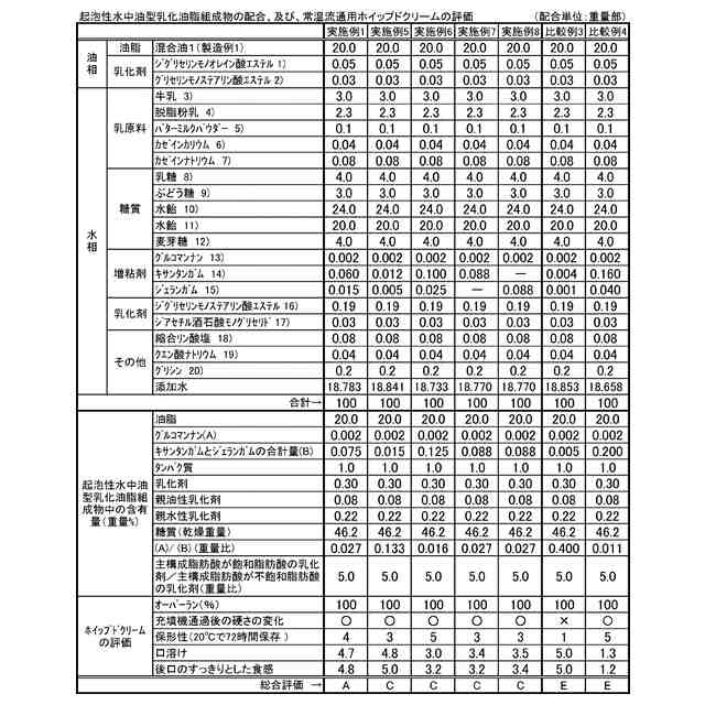 起泡性水中油型乳化油脂組成物全体中、親水性乳化剤0.01~0.99重量%、タンパク質0.2~2重量%、グルコマンナン0.0005~0.05重量%、キサンタンガム及び/又はジェランガム0.007~0.15重量%を水に溶解した水相に、