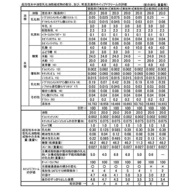即ち、本発明の第一は、起泡性水中油型乳化油脂組成物であって、水中油型乳化油脂組成物全体中、油脂を18~25重量%、グルコマンナンを0.0005~0.05重量%、キサンタンガム及び/又はジェランガムを0.007~0.15重量%、タンパク質を0.2~2重量%、乳化剤を0.05~1重量%含有し、前記油脂のSFCが、20℃で60~80%且つ30℃で25~38%であり、前記乳化剤の内、水中油型乳化油脂組成物全体中、水相中に親水性乳化剤を0.01~0.99重量%含み、油相中に親油性乳化剤を0.01~0.99重量%含み、且つ前記乳化剤の内、主構成脂肪酸が不飽和脂肪酸の乳化剤に対する主構成脂肪酸が飽和脂肪酸の乳化剤の重量比が1~50である、常温で流通するホイップドクリームに用いるための起泡性水中油型乳化油脂組成物に関する。好ましい実施態様は、キサンタンガム及びジェランガムの合計量に対するグルコマンナンの重量比が0.005~0.8である、上記記載の起泡性水中油型乳化油脂組成物に関する。本発明の第二は、上記記載の起泡性水中油型乳化油脂組成物がホイップされた常温流通用ホイップドクリームに関する。本発明の第三は、上記記載の常温流通用ホイップドクリームを含む食品に関する。本発明の第四は、油脂を水中油型乳化油脂組成物全体中18~25重量%含み、前記油脂のSFCが20℃で60~80%且つ30℃で25~38%である起泡性水中油型乳化油脂組成物を製造する方法であって、起泡性水中油型乳化油脂組成物全体中、親水性乳化剤0.01~0.99重量%、タンパク質0.2~2重量%、グルコマンナン0.0005~0.05重量%、キサンタンガム及び/又はジェランガム0.007~0.15重量%を水に溶解した水相に、起泡性水中油型乳化油脂組成物全体中、親油性乳化剤0.01~0.99重量%を前記油脂に溶解した油相を添加して予備乳化し、殺菌処理した後に、均質化してから、冷却することを特徴とする、常温で流通するホイップドクリームに用いるための起泡性水中油型乳化油脂組成物の製造方法に関する。本発明の第五は、上記製造方法で得られる起泡性水中油型乳化油脂組成物をホイップすることを特徴とする、常温で流通するホイップドクリームの製造方法に関する。
