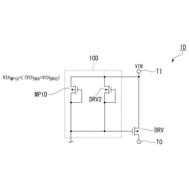 ゲート端子とドレイン端子とが前記第1トランジスタのゲート端子に接続され、ソース端子が前記入力端子に接続され、閾値電圧が前記第1トランジスタの閾値電圧より小さい第6トランジスタと、