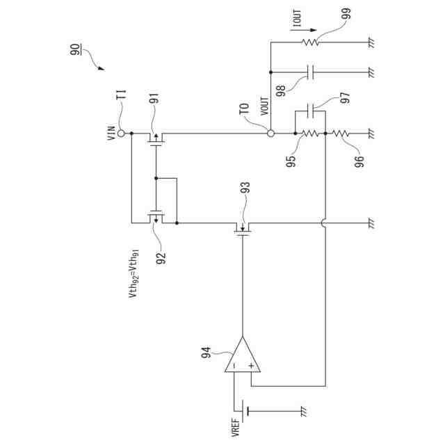 従来技術に係るボルテージレギュレータ90では、ミラー構造を有する出力トランジスタ91と、Pチャネル型のトランジスタ92とは、互いに同一の構造を有する素子とすることが一般的である。すなわち、従来技術に係る出力トランジスタ91と、Pチャネル型のトランジスタ92とは、互いに同一の閾値電圧を有していることが一般的である。