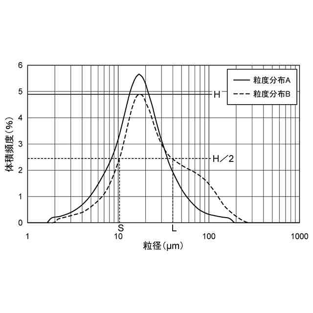 分散処理を行わずに前記レーザー回折・散乱法によって測定される体積基準の粒度分布Bにおける最大体積頻度をHとしたときに、H/2の体積頻度を示す粒子径のうち、最も大きな粒子径を示す粒径をLとし、最も小さな粒子径を示す粒径をSとしたときに、前記Sに対する前記Lの比が5以上である。