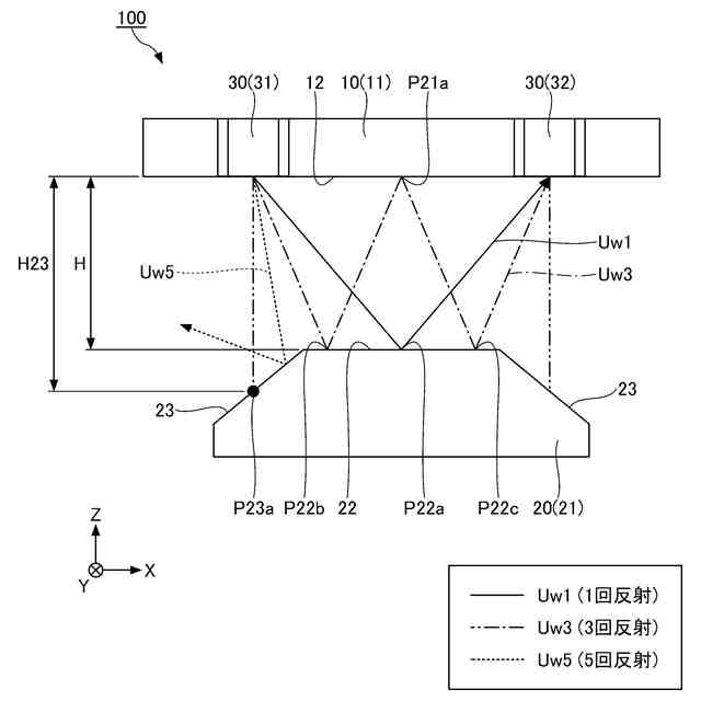 以下、実施形態に係る超音波風速計について、添付の図面を参照しながら説明する。尚、本明細書及び図面において、実質的に同一の構成要素については、同一の符号を付することにより重複した説明を省く場合がある。また、本明細書において、「上」及び「下」との用語を使用する場合がある。これは、図2に示されている状態における「上」及び「下」であり、Z軸方向において、天板11が配置されている方を「上」とし、反射板21が配置されている方を「下」とする。実際の超音波風速計100の配置はこれに限定されない。また、本明細書では「超音波発振器」としているが、超音波を発振する機能だけではなく超音波受信器としての機能も有している。