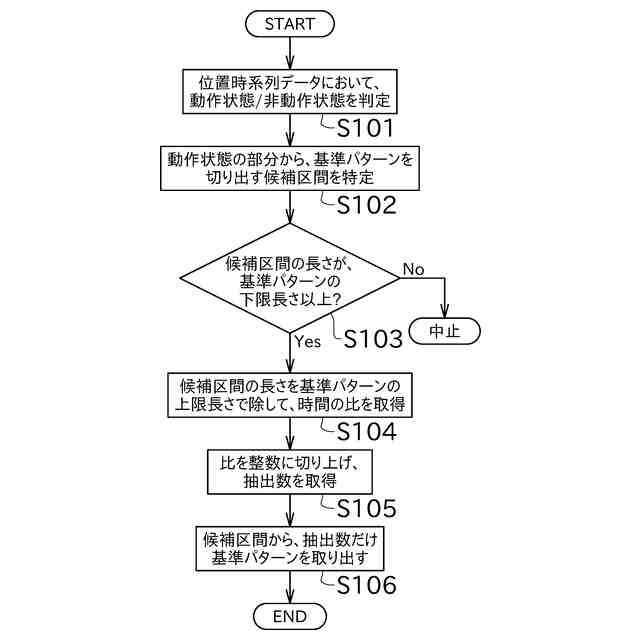 繰返し再生される各軸の位置時系列データを取得し、前記記憶された基本データとのマッチングの有無を判断する探索処理部と、
