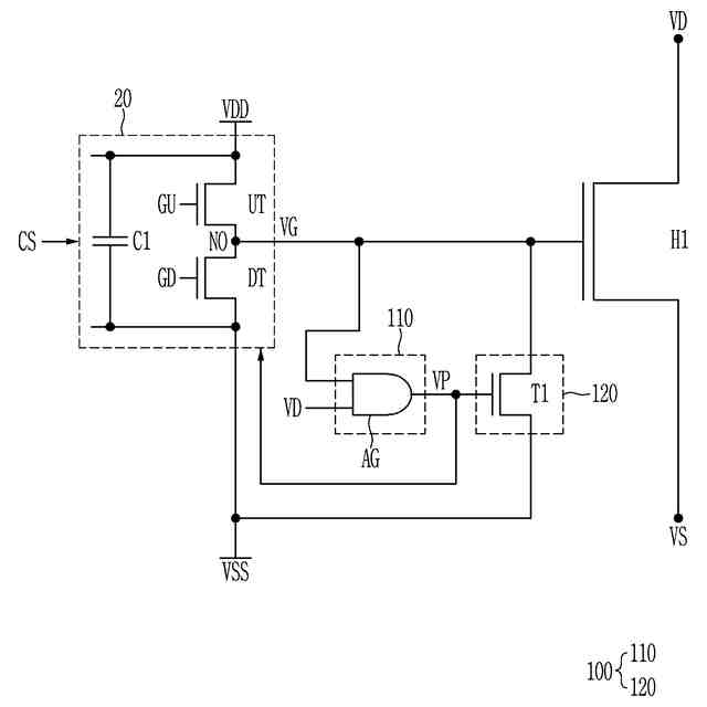 前記ANDゲート回路の出力端と前記第1トランジスタのゲート電極との間に連結されている第3電圧調整器(205)をさらに含み、