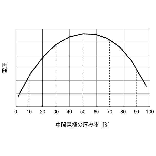 中間電極の厚み率と電圧との関係を示すグラフである。