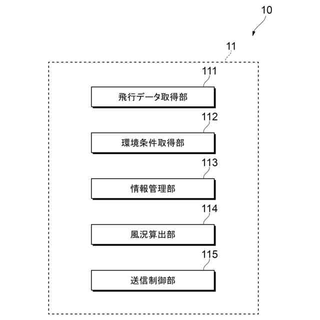 請求項6に記載された発明は、コンピュータに、風況の観測対象となる観測対象位置を飛行した飛行体の姿勢制御の時系列データを含む飛行データを取得する機能と、前記観測対象位置の環境条件に関する環境条件データを取得する機能と、取得した前記飛行データと、前記環境条件データとに基づいて、前記観測対象位置の風況を算出する機能と、を実現させるためのプログラムである。