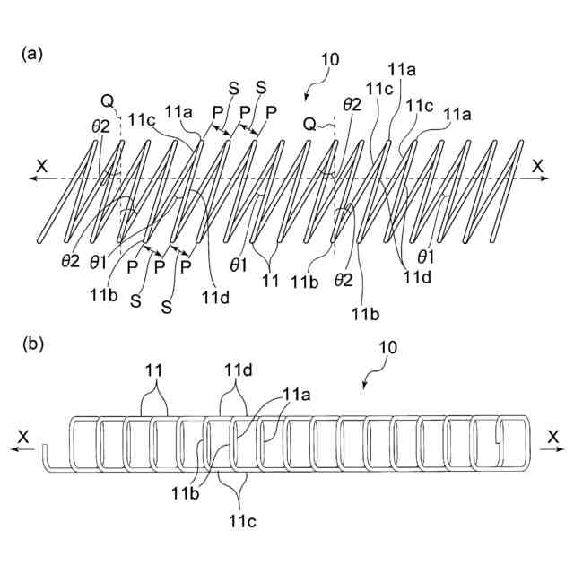 【解決手段】隣接する一対のプレキャストPC床版20の間の継手部22に配筋されて、両側のプレキャストPC床版20の端面20aから突出する継手鉄筋21と共に、継手部22の配筋構造15を形成するスパイラル鉄筋であって、一本の鉄筋を曲折加工することによって、矩形状の正面形状を有する単位スパイラル鉄筋11を複数連続させたスパイラル形状を備える。単位スパイラル鉄筋11は、矩形状の正面形状の左右一対の垂直辺部分11a,11b及び一方の水平辺部分11cが、仮想の基面Pに沿って配置され、他方の水平辺部分11dが、基面Pに対して傾いた方向に延設しており、Zスパイラル形状を有する。基面Pは、上面視してスパイラルの軸方向Xと垂直な面Qに対して傾いている。