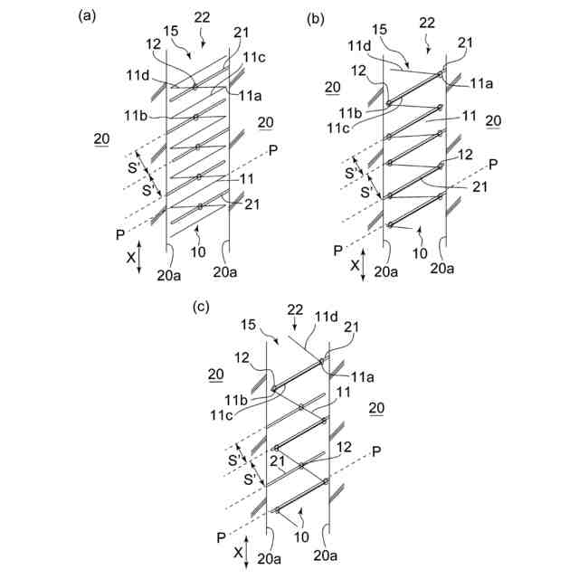 また、道路橋におけるカーブ部分や、橋脚が橋軸方向に対して斜めに配置されている部分においては、プレキャストPC床版として、例えば平行四辺形状の平面形状を有し、ループ継手部がプレキャストPC床版の長辺部分に沿った端面から斜めに突出しているプレキャストPC床版を用いることになるため、隣接する一対のプレキャストPC床版の間の継手部が延設する方向が、橋軸方向と垂直な方向に対して斜めの方向となることによって、各々のプレキャストPC床版の長辺部分に沿った端面部分に対するループ継手筋の突出方向は、継手部の延設する方向に対して斜めに傾いた方向となる場合がある。特許文献1のプレキャスト床版の継手部構造では、上述のとおり、螺旋鉄筋は、中心軸に対する螺旋の角度が一定となっていることから、継手部が橋軸方向と垂直な方向に対して斜めの方向に延設していて、ループ継手筋の突出方向が、継手部が延設する方向に対して斜めに傾いている場合には、継手部にスパイラル鉄筋を配筋する際により多くの手間を要することになる。
