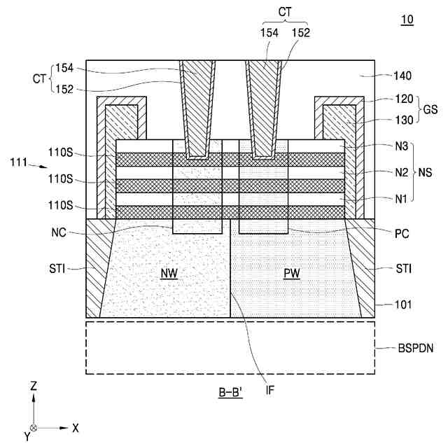 本発明の技術的思想による半導体素子は、互いに対向する第1面及び第2面を有する基板及び前記基板を貫通する1対の素子分離膜;前記1対の素子分離膜の間の前記基板で第1水平方向に沿って配置され、互いに接触する第1ウェル領域及び第2ウェル領域と、前記第1ウェル領域及び前記第2ウェル領域上に垂直方向に交互に積層されたナノシート及び犠牲絶縁パターンと、前記第1ウェル領域上で前記ナノシート及び前記犠牲絶縁パターンを前記垂直方向に貫通して前記第1ウェル領域に連結された第1不純物導電部と、前記第2ウェル領域上で前記ナノシート及び前記犠牲絶縁パターンを前記垂直方向に貫通して前記第2ウェル領域に連結された第2不純物導電部と、前記第1不純物導電部の上部に連結された第1コンタクトと、前記第2不純物導電部の上部に連結された第2コンタクトと、前記基板の前記第2面の下に配置される背面電力配線構造物(back side power distribution network)と、を含む。
