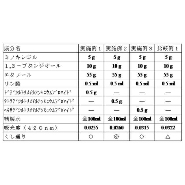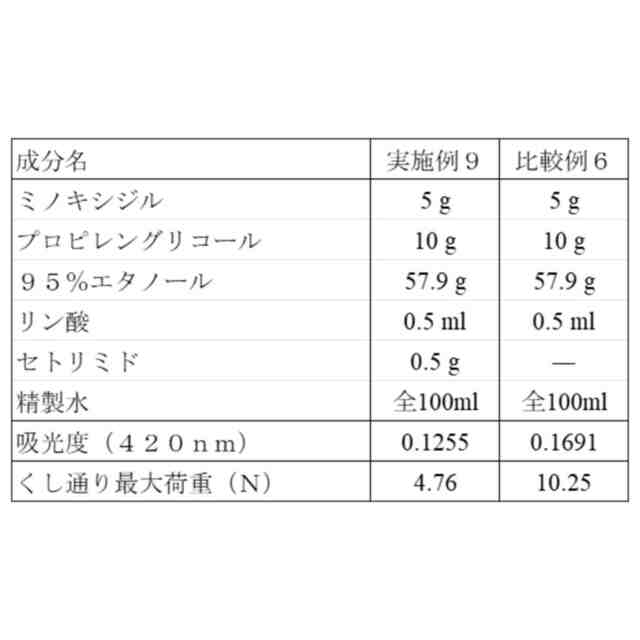 また、ミノキシジル含有製剤は、頭部に長期間にわたって毎日使用するものであるため、使用感においても優れたローション剤が求められており、特許文献4には、くし通りの良好な、ミノキシジル含有ローション剤が記載されている。このように、ミノキシジルを含有する組成物において、着色の課題やくし通りに関して種々の研究がなされているが、より製品価値を高めるため、多様な手段で着色抑制や使用感の良さ等、検討されている。