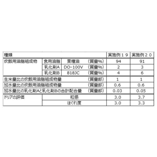 [1]食用油脂に乳化剤A、および、乳化剤Bを含む、ソース掛け飯類用の炊飯用油脂組成物であって、