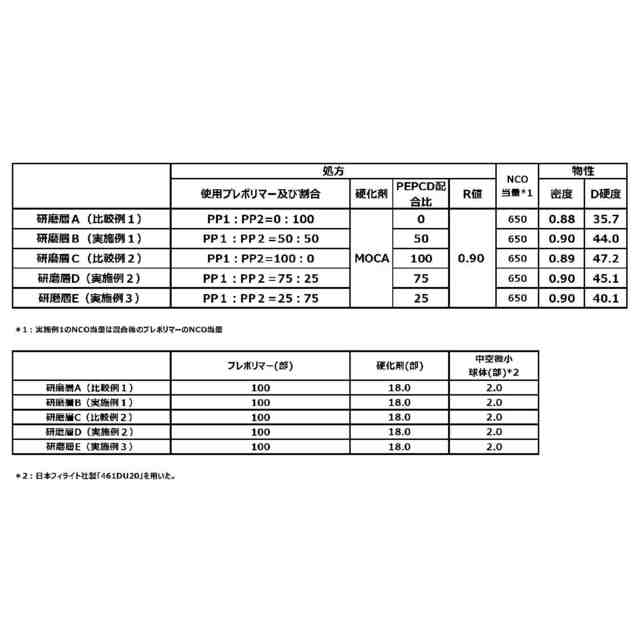 ところで、半導体デバイスの研磨に用いられる研磨層の材料として、イソシアネート成分(トルエンジイソシアネート(TDI)など)及び高分子量ポリオール(ポリオキシテトラメチレングリコール(PTMG)など)を含むプレポリマーと、ジアミン系硬化剤(4,4’-メチレンビス(2-クロロアニリン)(MOCA)など)とを反応させて得られる硬質ポリウレタン材料が用いられる。この硬質ポリウレタン材料は、高分子量ポリオールで形成されるソフトセグメントと、ウレタン結合やウレア結合で形成されるハードセグメントにより構成されている。近年、半導体デバイスの配線の微細化に伴い、従来の研磨層又は研磨パッドでは、トポ性能や研磨レートが不十分である場合があり、さらなる検討がなされている。