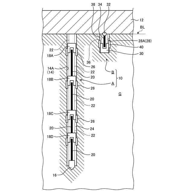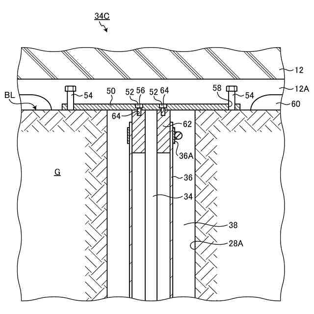 図8に、層別沈下計による計測結果の一例を示す。縦軸が深度、横軸が沈下量で、グラフはとある建物の施工過程における支持地盤沈下量の深度分布を示している。この建物の基礎底面レベルBLの深度はTP-10mであるが、先述の理由により最も浅い沈下センサー3はTP-12mに設置している。このグラフより、基礎底面レベルBLに近くなるほど地盤Gの沈下量が大きくなり、最も浅い沈下センサー3で40mm程度の沈下量が得られている。基礎底面レベルBLにおいてはこれよりさらに大きな沈下量となっていると考えられるが、基礎底面レベルBLに直接沈下センサー3を設けることができないため、基礎底面レベルBLの地盤沈下量を直接計測することができない。このため、基礎底面レベルBLの地盤沈下量についても直接計測することができる技術が求められていた。