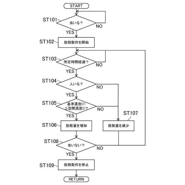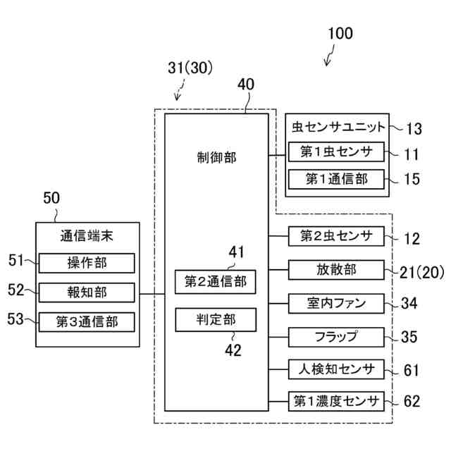 第1の態様では、気流生成部(34)が対象空間(S)の空気をガスセンサ(10)の検知領域に搬送するので、例えば複雑な間取りや面積の広い対象空間(S)であっても、対象空間(S)の構造に関係なく、対象空間(S)に対象虫種の虫(I)がいる場合には該虫(I)の発するガスをガスセンサ(10)の検知領域に搬送できる。これにより、対象空間(S)に存在する虫(I)の検出精度を向上できる。そして、制御部(40)は検出精度が向上したガスセンサ(10)の検出値に基づいて駆除部(20)を制御するので、対象空間(S)に存在するガスを発する虫(I)又は該虫(I)と同一種の虫(I)を確実に駆除できる。これにより、対象空間(S)の虫を低減することができる。