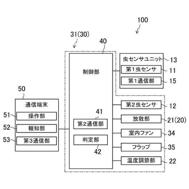 第2の態様では、制御部(40)が対象空間(S)の空気を攪拌する第1運転を実行するので、対象空間(S)の空気が攪拌されることで虫(I)が発するガスをより確実にガスセンサ(10)の検知領域に搬送できる。これにより、ガスセンサ(10)で虫(I)のガスをより確実に検出できる。