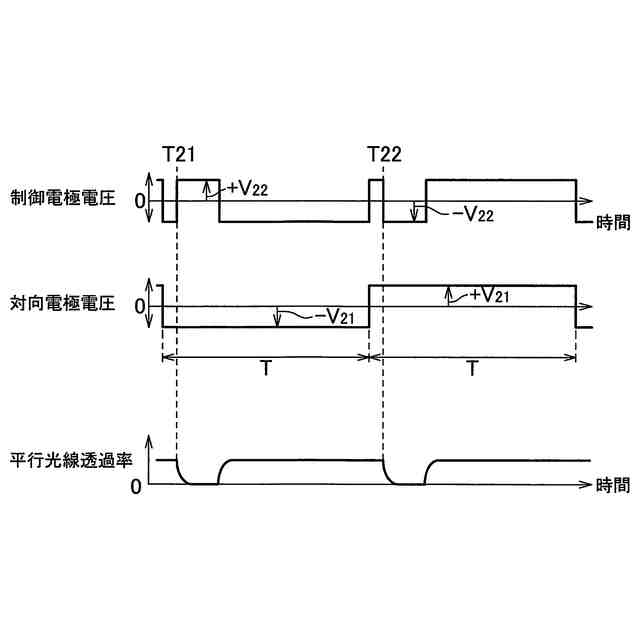 【解決手段】リバースモードのスクリーン21の対向電極26には、光学層の光学状態を変化させる周期の2倍の周期で、正の電圧V11と0ボルトとの間で変化する矩形波電圧を印加し、制御電極27には、対向電極26に印加した矩形波電圧と同じ周期かつ同相でV11と同じ値である正の電圧V12と0ボルトとの間で変化する矩形波電圧に光学層25の光学状態を変化させるタイミングで光学状態が変化する電極間電位差となるパルス電圧を重畳させて印加するように制御する。