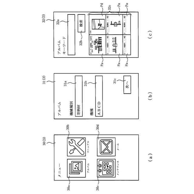 (a)は、メニュー画面を表す図であり、(b)は、アルバムトップ画面を表す図であり、(c)は、アルバム表示画面を表す図である。