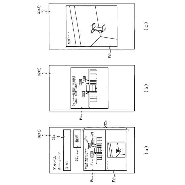 (a)は、アルバム表示画面において、キーワード入力エリアに入力された箇所に該当する画像を表示する場合を表す図であり、(b)は、周囲画像を拡大表示した場合を表す図であり、(c)は、詳細画像を拡大表示した場合を表す図である。