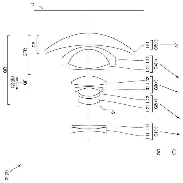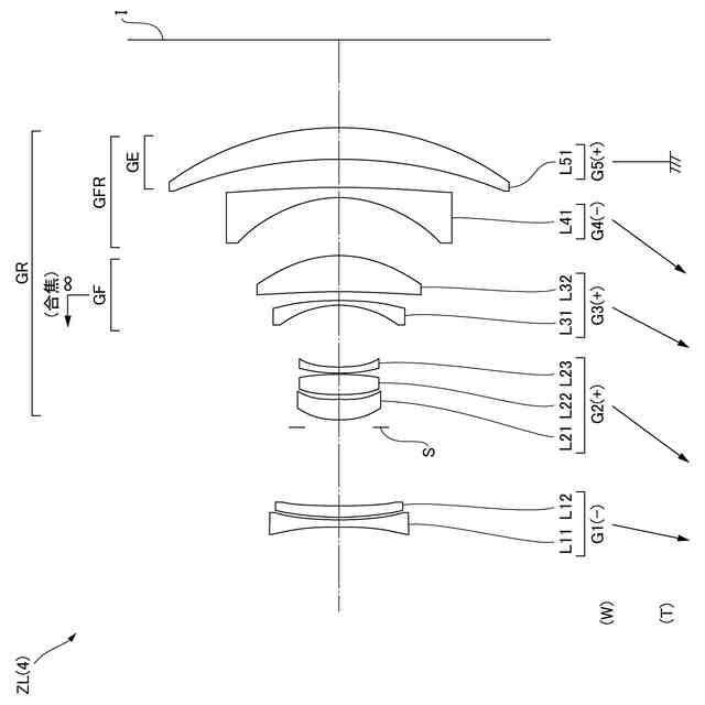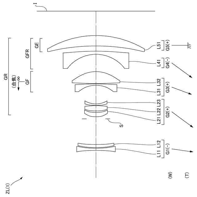 次に、第1実施形態に係る変倍光学系について説明する。第1実施形態に係る変倍光学系(ズームレンズ)ZLの一例としての変倍光学系ZL(1)は、図1に示すように、光軸に沿って物体側から順に並んだ、負の屈折力を有する第1レンズ群G1と、少なくとも1つのレンズ群を有する後群GRとから構成される。変倍の際に、隣り合う各レンズ群の間隔が変化する。また、後群GRの少なくとも1つのレンズ群における、いずれかのレンズ群の少なくとも一部は、合焦の際に光軸に沿って移動する正の屈折力を有する合焦群GFである。