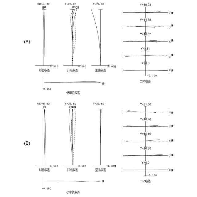 図4(A)、図4(B)はそれぞれ、第2実施例に係る変倍光学系の広角端状態、望遠端状態における無限遠合焦時の諸収差図である。