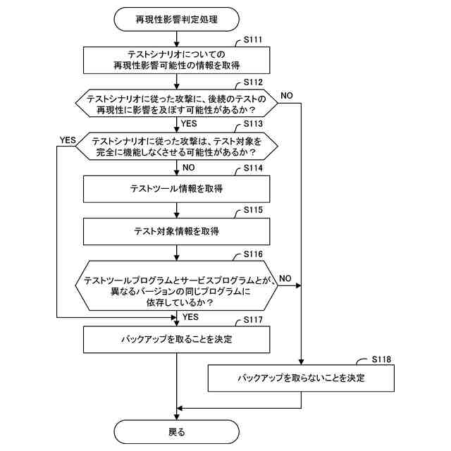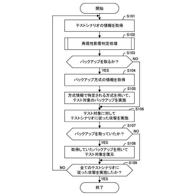 前記バックアップ部は、前記テストシナリオデータベースにおいて前記先行の攻撃が従う前記テストシナリオについての識別情報に対応付けられて格納されている前記方式情報により特定される前記バックアップの方式を用いて、前記メモリ領域のバックアップを取る、
