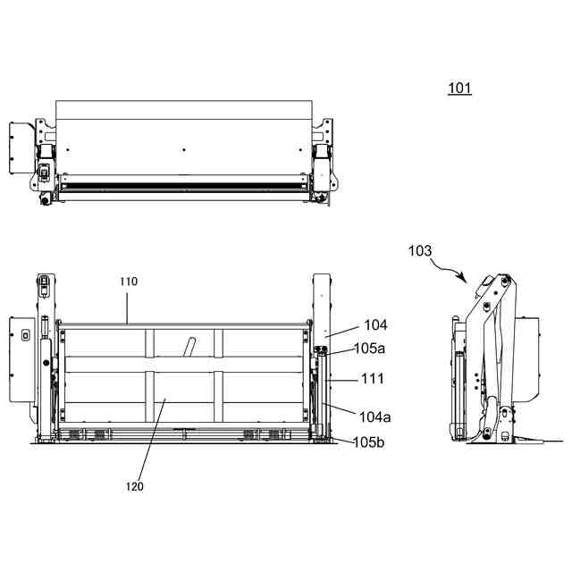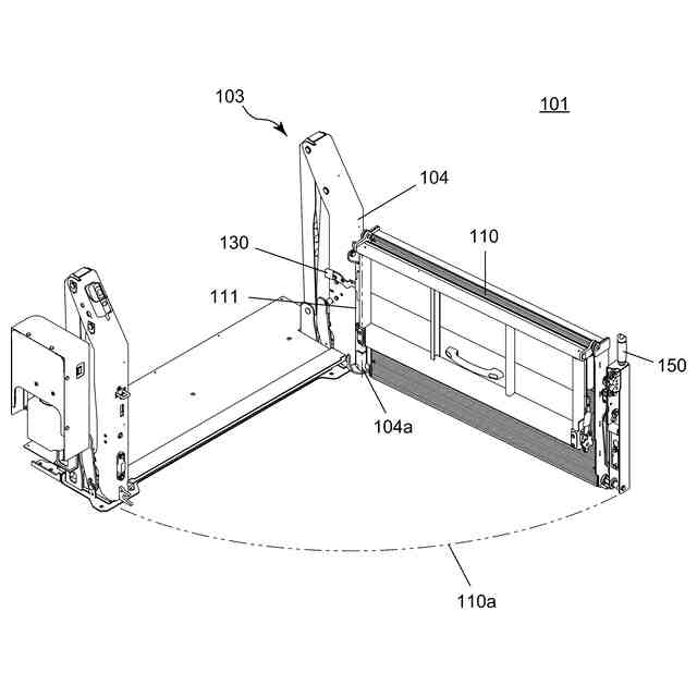 図1,2は、他の従来の昇降装置101を示す。図1では、回転フレーム110が横閉状態(回転フレーム110が閉じた状態)で、図2では、回転フレーム110が横開状態(回転フレーム110が開いた状態)である。昇降装置101は、図1のように、回転フレーム110(プラットホーム120)が起立姿勢のまま車両に格納できる。昇降装置101は、4節リンク式等の駆動装置の一方のサイドフレーム104と概略並行の縦軸104aの周りで回転可能なターンパイプ111を有し、回転フレーム110はターンパイプ111とともに横回転(水平方向回転)可能である。図2の二点鎖線110aは回転フレーム110の回転軌跡を示し、回転軌跡110aの内側は干渉区域である。