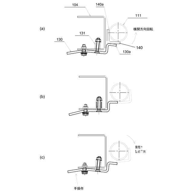 回転フレーム110を閉じる(横開状態から横閉方向に横回転させる)には、手操作でロックレバー130を移動させ、図3(c)のように、先端130aと凹部140aの係合を外して横開ロックを解除する必要がある(回転フレーム110の横回転が可能になる)。