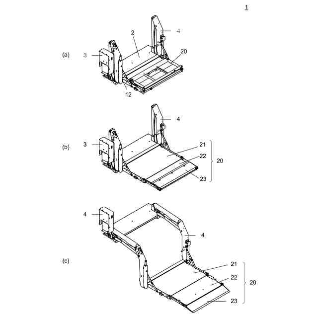 本分野の昇降装置は、車両への荷物の積み降ろしのためのプラットホームの昇降機能を有するが、軽量荷物等のときは上記昇降機能は使用せず、プラットホームを起立姿勢としたままで横開き(横回転)させて荷物を出し入れできることが便利である。