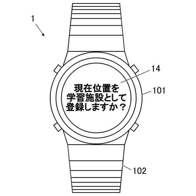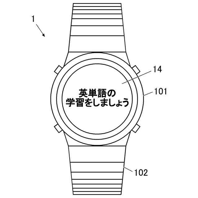 まず、本発明の実施形態における電子機器1の構成について説明する。図1に示すように、電子機器1は、リストウォッチ型(腕時計型)の外観を有し、ユーザに所定の情報を表示するための表示部14を備えた機器本体101と、ユーザの手首に巻き付けることにより機器本体101を手首に装着するためのベルト部102と、を備えている。電子機器1には、学習用アプリケーション121が搭載されており、ユーザが電子機器1を用いて学習できるようになっている。