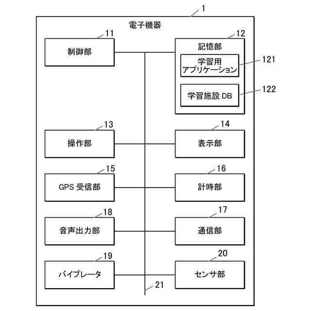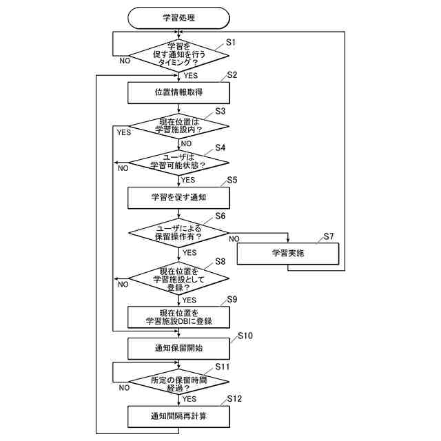 【解決手段】電子機器は、学習を促す通知を行うタイミングS1において、位置情報取得を行いS2、現在位置が学習施設内ではなくS3NO、ユーザは学習状態である場合S4YES、学習を促す通知を行いS5、ユーザによる保留操作有の場合S6YES、現位置を学習施設として登録する指示があるとS8YES、現在位置を学習施設DBに登録S9した上で通知保留開始を行いS10、所定の保留時間が経過するとS11、通知間隔再計算を行いS12、位置情報取得S2以降の処理を繰り返す。