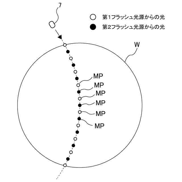 図7から分かるように、ウェーハW上の測定点MPが多いほど、より精密な膜厚分布(または膜厚プロファイル)が得られる。しかしながら、フラッシュ光源の発光周期を短くすると、フラッシュ光源の発光原理上、フラッシュ光源の光の強さがばらつくことがある。すなわち、フラッシュ光源の発光周期が短すぎると、発光するためにフラッシュ光源に蓄えられる電力エネルギーが安定せず、結果として、フラッシュ光源から発せられる光の強さが不安定となる。