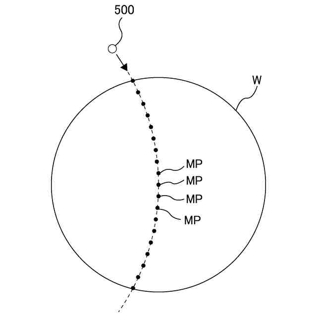 図7は、光学式膜厚測定システムにより測定される膜厚の複数の測定点の一例を示す模式図である。図7に示すように、光学センサヘッド500は、ウェーハWの表面を横切りながら複数の測定点MPに光を照射する。光学センサヘッド500は、図示しないフラッシュ光源に接続されており、フラッシュ光源によって発せられた光が光学センサヘッド500に伝達される。光学センサヘッド500がウェーハWの表面を横切るたびに、図7に示すように、複数の測定点MPでの膜厚が測定される。