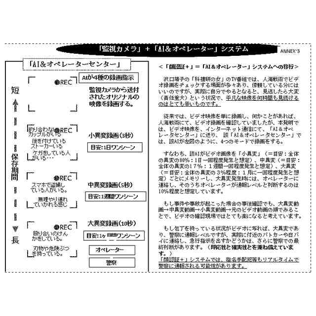 すなわち、該AIが該監視カメラから送付された該ビデオ映像を、オリジナルのままと、「小異変」(=目安:全体の異変の80%:日に一回程度発生と想定)、中異変(=目安:全体の異変の17%:週間で一回程度発生と想定)、大異変(=目安:全体の異変の3%程度:月に一回程度発生と想定)ごとに録画し、大異変発生時には、オペレーターに連絡をし、必要に応じオペレーターが警察への通報をするシステムを構築する。