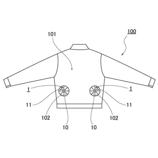 実施例1の衣服用ファンが装着された衣服を示す図である。