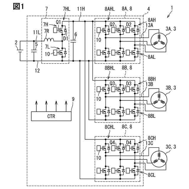 前記電力変換回路は、第1回転電機に対応する第1インバータ(8A)と、第2回転電機に対応する第2インバータ(8B)と、を含み、