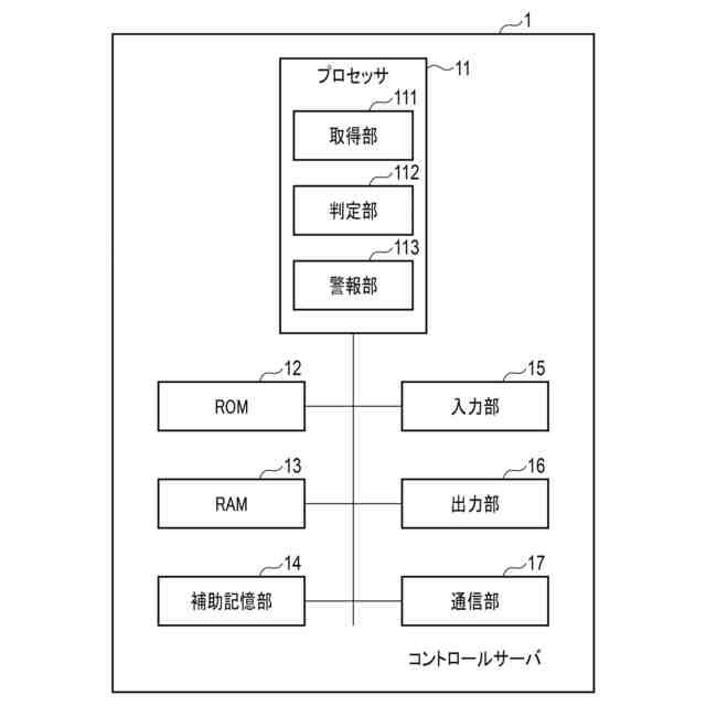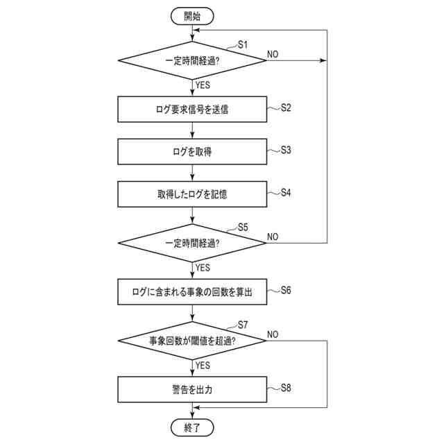 【解決手段】 一実施形態に係るサーバは、一定周期で外部装置にログ送信を要求する信号を出力することにより前記外部装置からログを取得する取得部と、取得した前記ログに含まれる事象を事象毎に分類することにより同様な事象が特定の期間に発生した回数を算出し、算出した事象回数が閾値を超過したか判定する判定部と、前記判定部により出力される判定結果に基づいて警告を発報する警報部と、を備える。