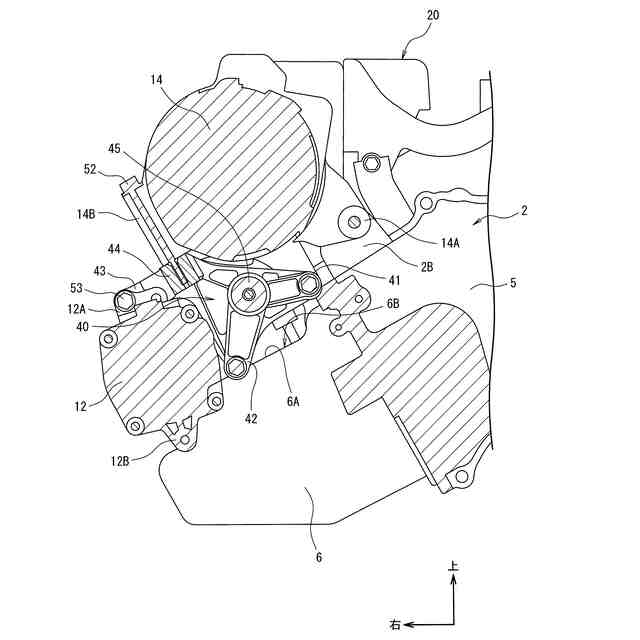 図2は、本発明の一実施例に係るエンジンのベルト伝動装置を備えたエンジンの底部の右側面図である。