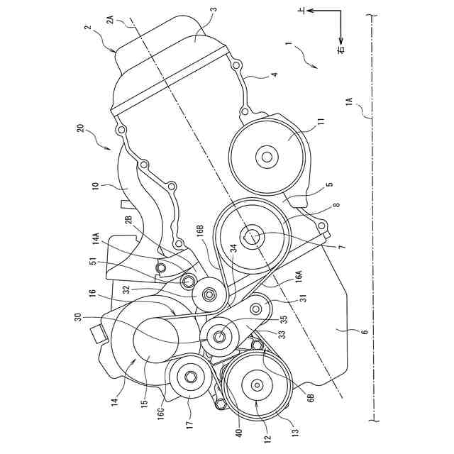 図1は、本発明の一実施例に係るエンジンのベルト伝動装置を備えたエンジンの正面図である。