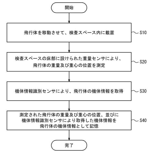 【解決手段】バッテリー駆動の飛行体を検査する検査方法であって、飛行体を移動させて、検査スペース内に載置することと、検査スペースの床部に設けられた重量センサにより、飛行体の重量及び重心の位置を測定することと、機体情報識別センサにより、飛行体の機体情報を取得することと、測定された飛行体の重量及び重心の位置、並びに機体情報識別センサにより取得した機体情報を飛行体の機体情報として記憶することと、を含む。