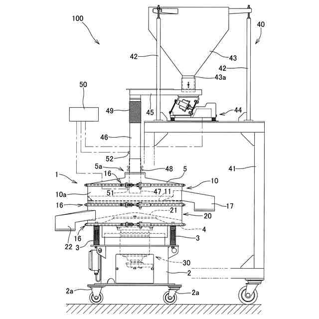また、振動ふるい装置において、前記内筒における前記第一のセンサの上方には、粉体の有無を検知する第二のセンサが設けられ、前記第二のセンサが前記粉体を検知した場合に、前記速度調整部が粉体の投入速度を小さくすることが好ましい。