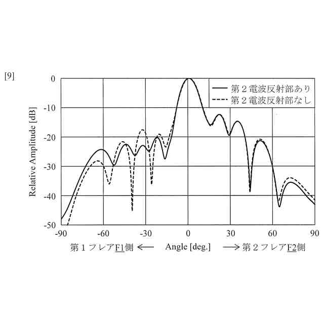 【解決手段】レーダアンテナは、第1フレアF1の平面とほぼ平行で第2フレアF2の平面と非平行な平面を有し、第1フレアF1に近い側及び第2フレアF2に近い側に電波を分割する電波分割部Pを備えることとした。すると、レーダアンテナの指向性は、第1フレアF1に近い側ではなく第2フレアF2に近い側に重みを有することとなる。