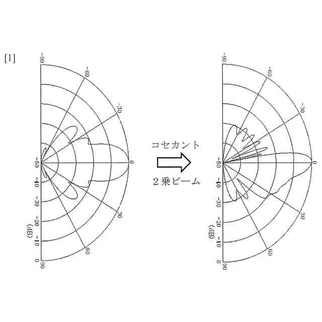 図1の右欄では、コセカント2乗ビームの垂直面内の指向性は、正面方向に最も強く、俯角又は仰角が大きくても強く残る。よって、沿岸又は空港地表面を監視するレーダ装置は、設置高を高くしても、近距離物標を探知することができ、仰角方向(空中)に向けて、不要放射を生じさせない。一方で、空港で空域にある航空機を監視するレーダ装置は、設置高を低くしても、近距離物標を探知することができ、俯角方向(地面)に向けて、不要放射を生じさせない。