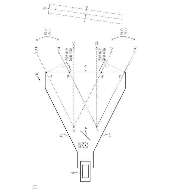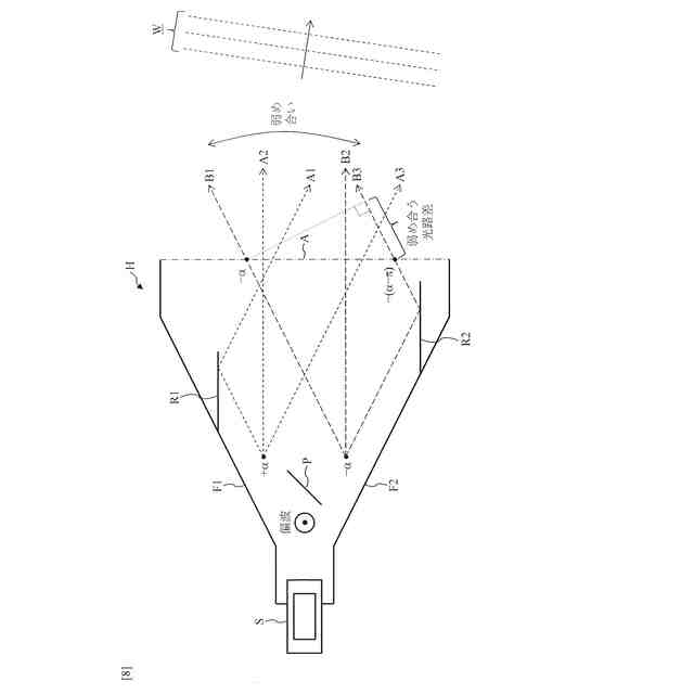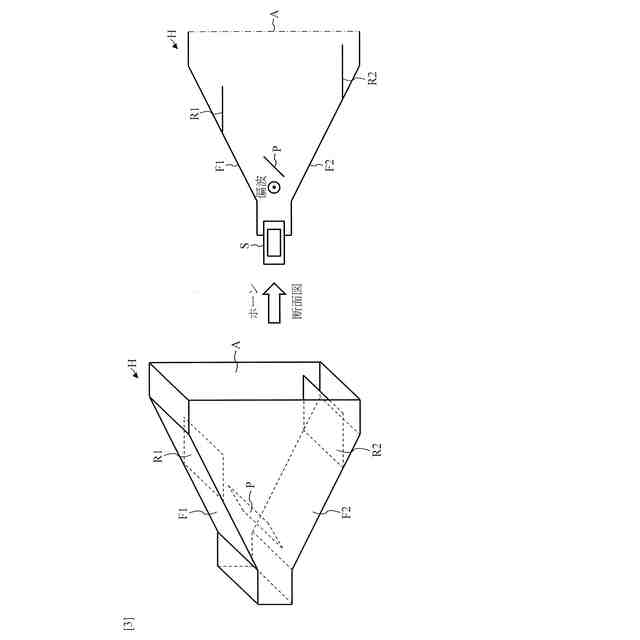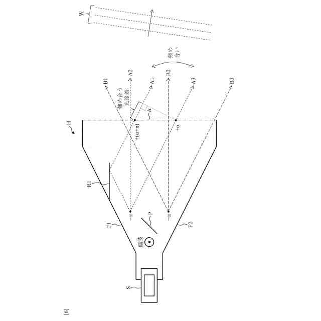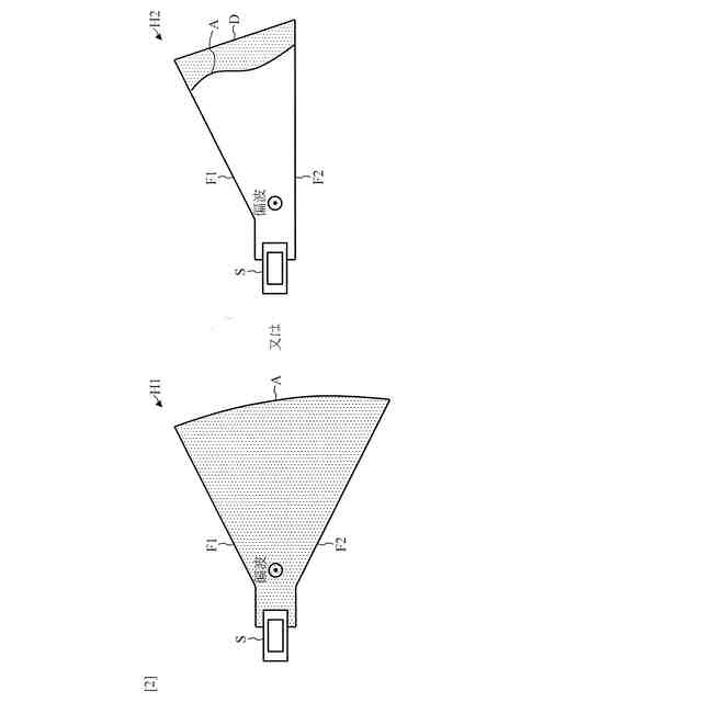 図2の左欄のレーダアンテナは、H面のセクトラルホーンH1を備える。セクトラルホーンH1は、波源S(導波管スロット等)から開口面Aへと開口する第1フレアF1及び第2フレアF2を備え、第1フレアF1及び第2フレアF2の管幅方向と平行な偏波方向(水平偏波)の電波を伝搬する。セクトラルホーンH1の内部は、誘電体を挿入され、セクトラルホーンH1の開口面Aは、特殊な形状の曲面を有する。セクトラルホーンH1の開口面Aにおいて、電波が屈折することにより、水平偏波のコセカント2乗ビームが形成される。