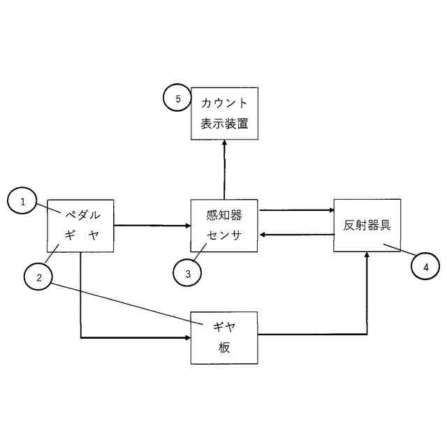 【解決手段】ギヤ(板)2に8等分に分けた反射器具(筒等)4内に受信板と遮断玉を組込み感知器(センサー)3の、スイッチとし反射器具(筒等)を取付た自転車用歩数計を構成する。感知器(センサー)3やカウント表示装置、此れらを図1の組み込みで自転車用歩数計を確実に挟持できる。