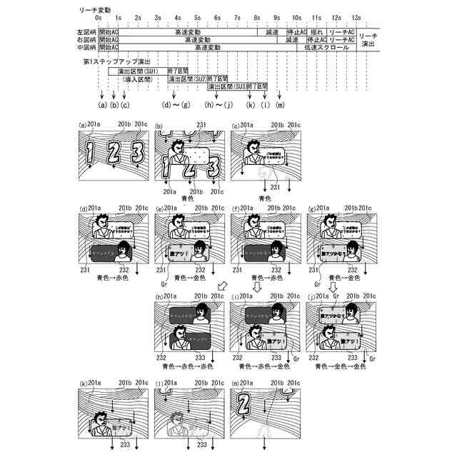 【解決手段】装飾図柄の変動表示は、開始動作、変動動作、減速動作、停止アクション動作及び待機動作を含み、変動動作では、開始動作、減速動作、停止アクション動作及び待機動作より装飾図柄の透過度が高い。予告演出は、装飾図柄が表示手段において変動表示される表示領域で装飾図柄に重ねられて実行され、演出の段階が進むほど特別遊技が行われる期待度が高くなる段階演出を含む。段階演出は、装飾図柄が変動動作に切り替えられる前に1段階目が開始され、装飾図柄が変動動作に切り替えられた後に2段階目以降が開始される。