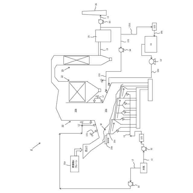 前記分解炉(11)から排出される排熱ガスを燃焼施設(2)へ送るための通風機(13)と、