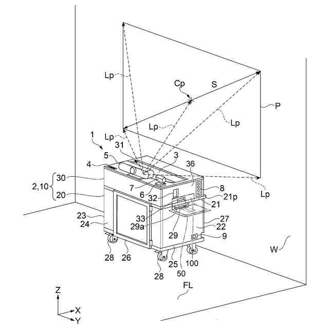 投射キャビネット2は、キャビネット本体10と操作パネル4とを有する。本実施形態において、キャビネット本体10は、ハウジングの一例である。本実施形態において、出力機器100は、物体の一例である。すなわち、本実施形態において物体の一例である出力機器100は、投射システム1の使用者であるユーザーによって操作される操作体である。