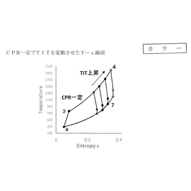 図2に典型的な(ファン+HPC)形式ターボファン・エンジンのコア側だけのT―s線図を示す。この図はサイクル圧力比(CPR)を一定に保ち、TITを変動させた場合の図である。CPRを一定に保ちながらTITを高くすると、コア推力になり得る熱エネルギー量が増加する。これはターボジェットのサイクルに近く、このようなエンジンは推力は増すがコアの排気速度が高くなるため離陸時の騒音が問題になる。