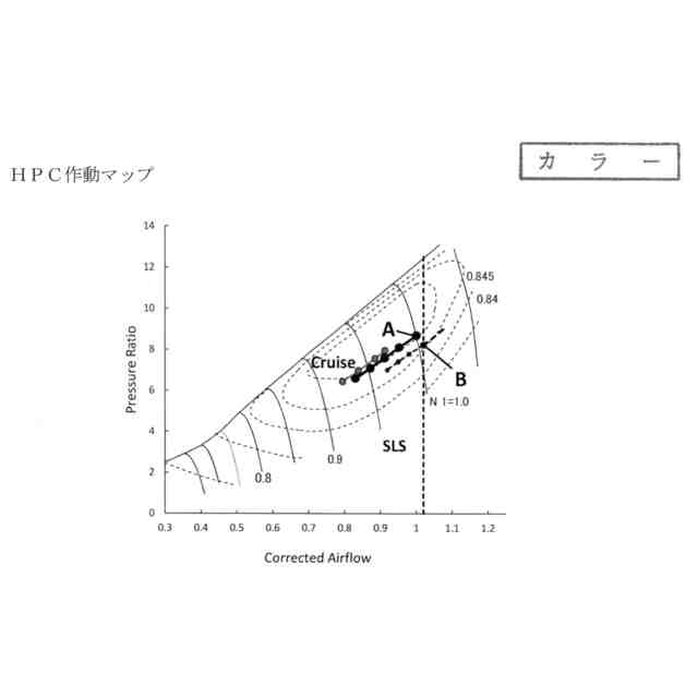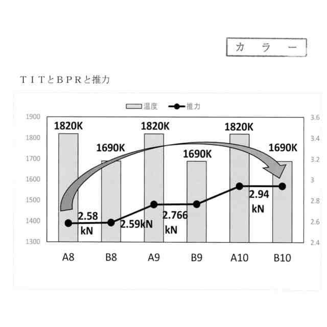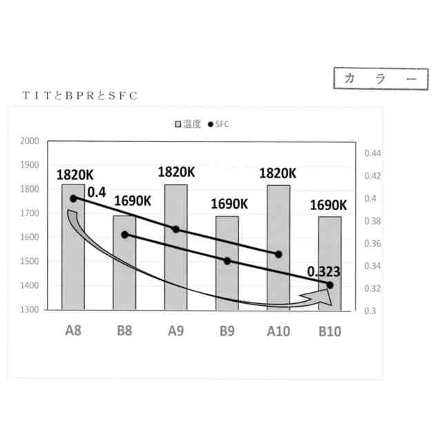 ターボファンの技術開発動向として、推進効率を高めるために高バイパス比化が進められてきた。しかしながらバイパス比を高めるには低圧系の仕事を増すためTITを高めねばならない。TITを高めれば上述のように多くの問題が生じ必ずしも環境対策に繋がらない。特許文献1では以上の点に鑑み、TITを高めず現実的な温度範囲で低圧タービン・ファン系の仕事を増しエンジン空気流量を増加、推力を保つオリジナリティに富んだ技術思想を生み出した。しかし軽量、小型、高推力が求められる航空用エンジンは、たとえTITを下げ推力を保つ新分野の創出であっても、推力の向上を無視することはできない。